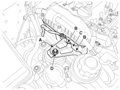 Crankshaft sprocket (A) -> Timing chain guide (B) -> Intake CVVT sprocket (C) -> Exhaust CVVT sprocket (D).