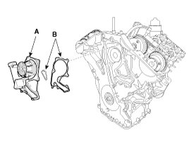 Install the water pump (A) with the new gaskets (B).
