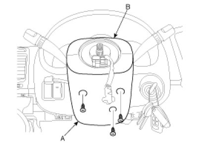 6. Loosen the screws, and then remove the steering column upper (B) and lower shrouds (A).