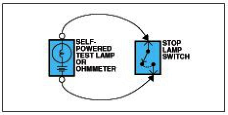 Use a self-powered test lamp or an ohmmeter to check for continuity.