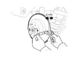 1. Place a dial gauge about 5mm (0.2 in.) from the outer circumference of the brake disc, and measure the runout of the disc.