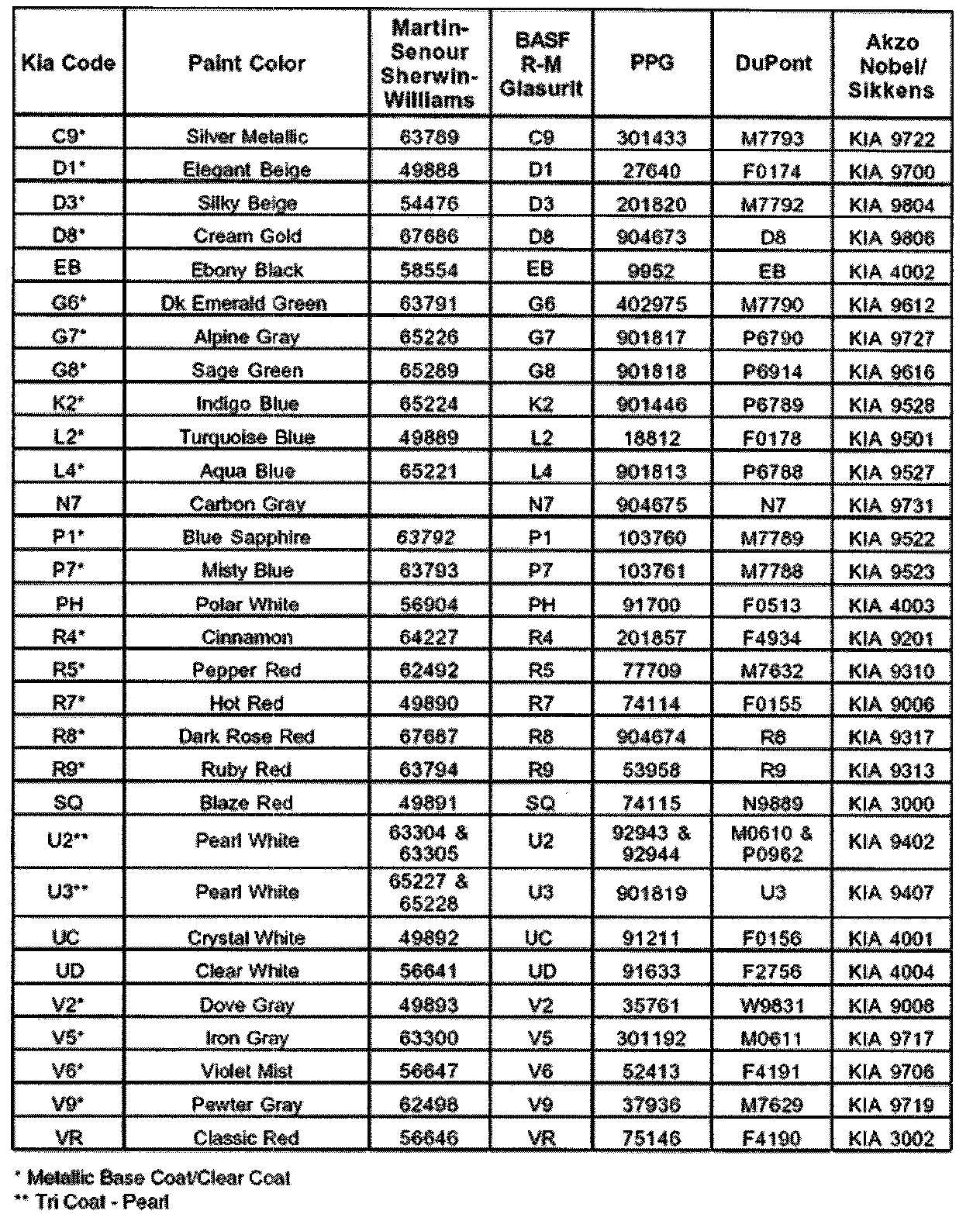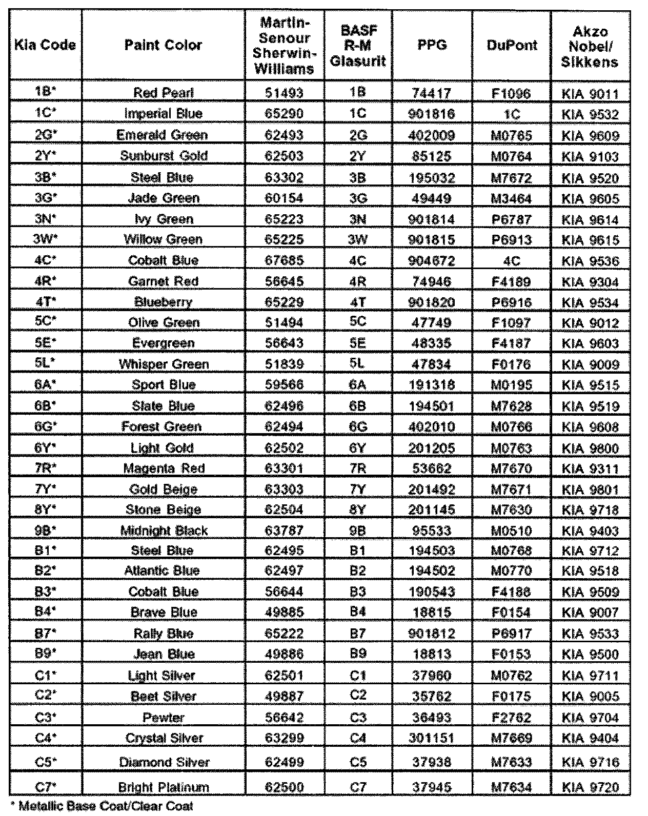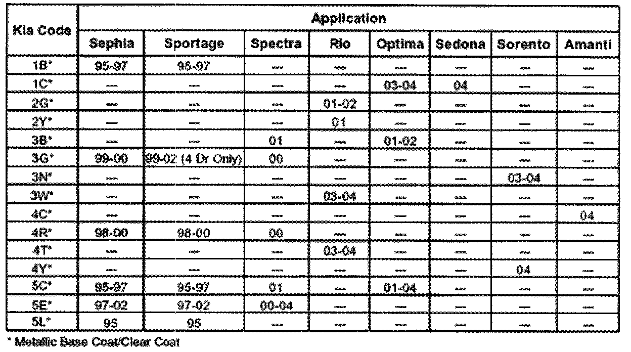 This article provides Kia paint color code application information for 1993 through 2004 Kia models along with corresponding refinish codes for five (5) major U.S paint manufacturers.