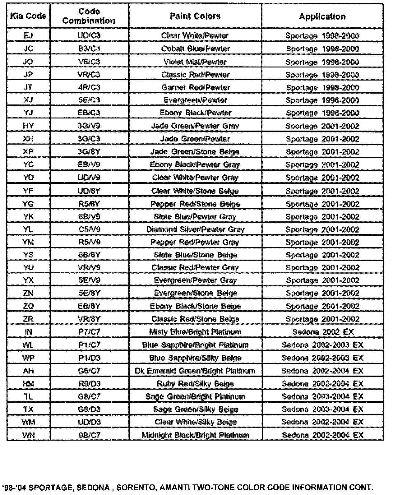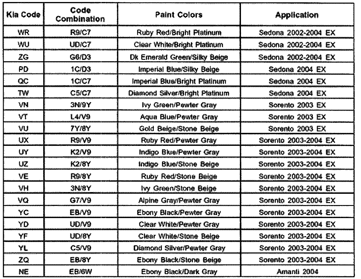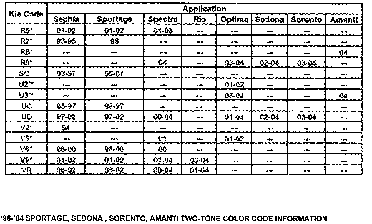 This article provides Kia paint color code application information for 1993 through 2004 Kia models along with corresponding refinish codes for five (5) major U.S paint manufacturers.