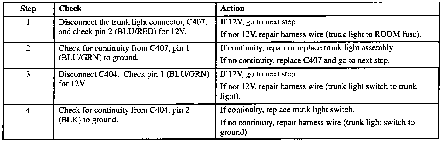 : Check condition of ROOM fuse. If fuse is open, locate and repair source of overload. Replace fuse. Also, check trunk bulb. Replace if necessary.