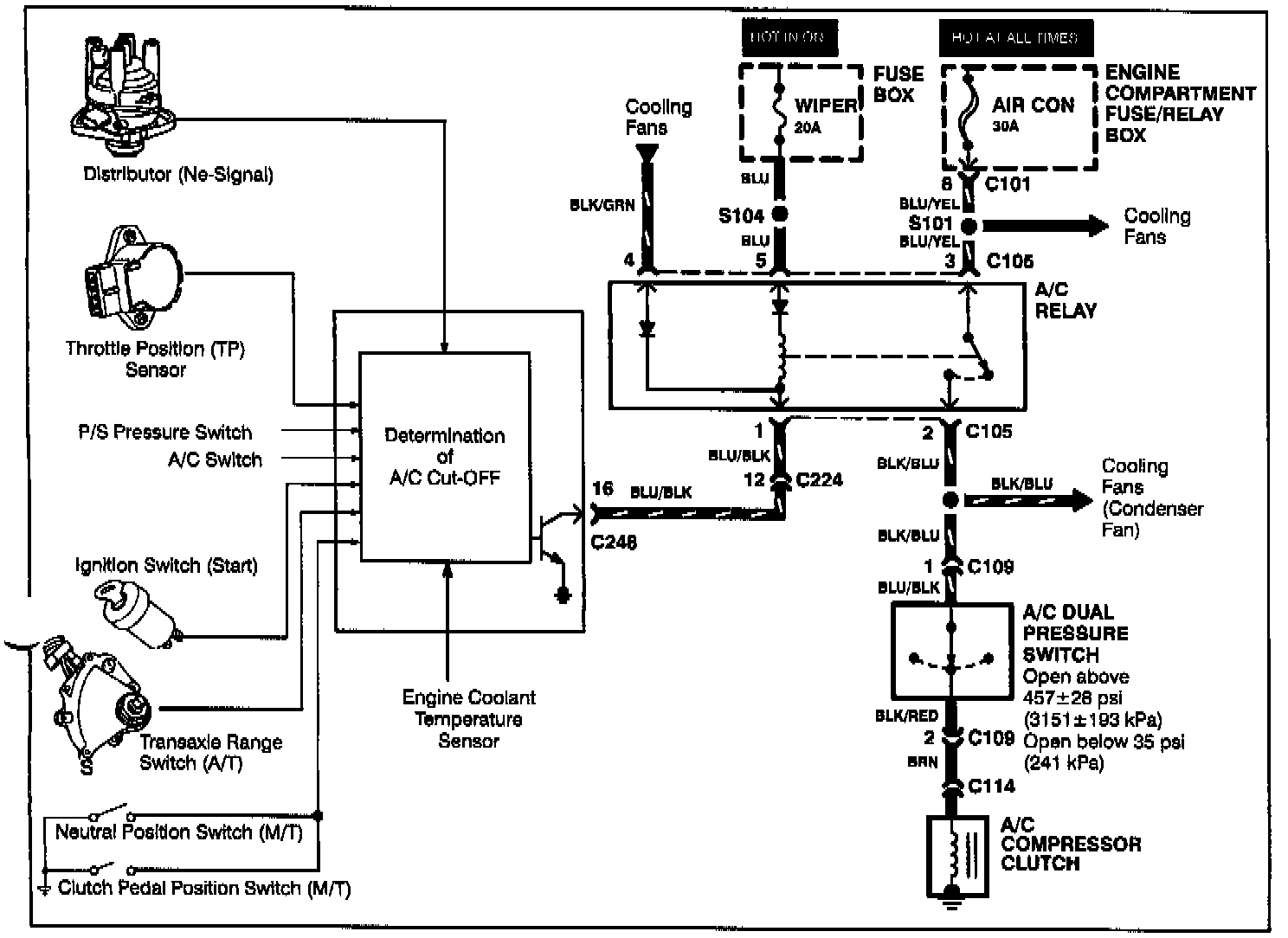 NOTE: The A/C compressor clutch and the condenser fan operate together.