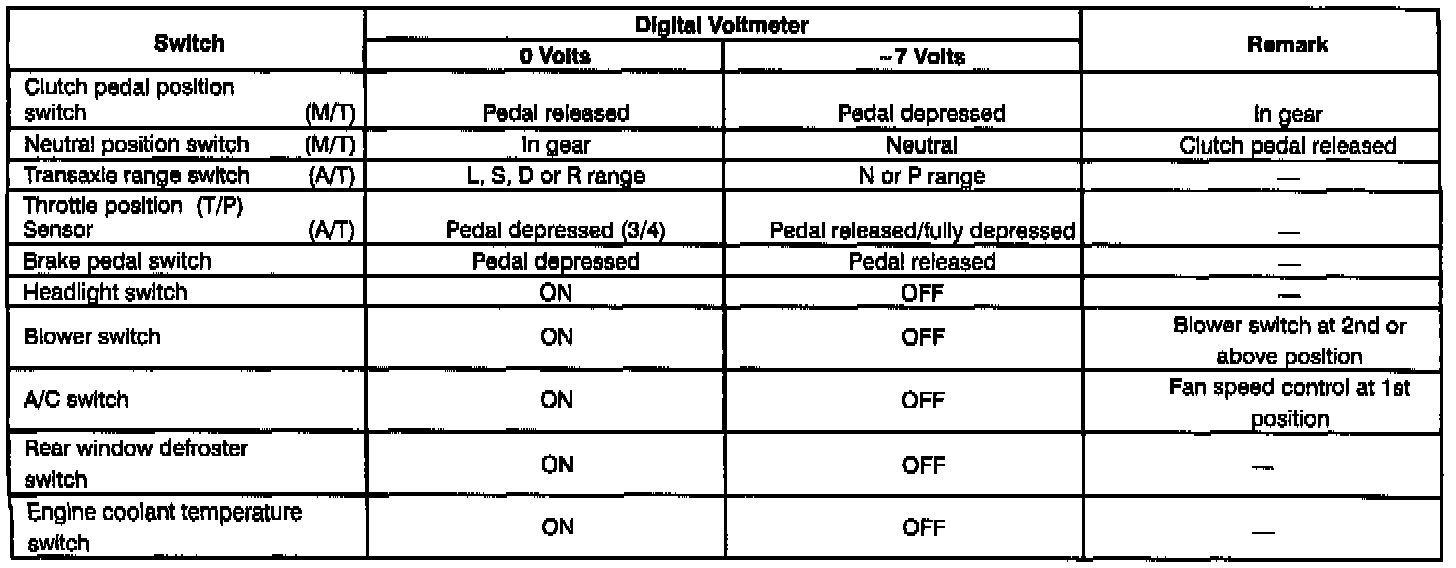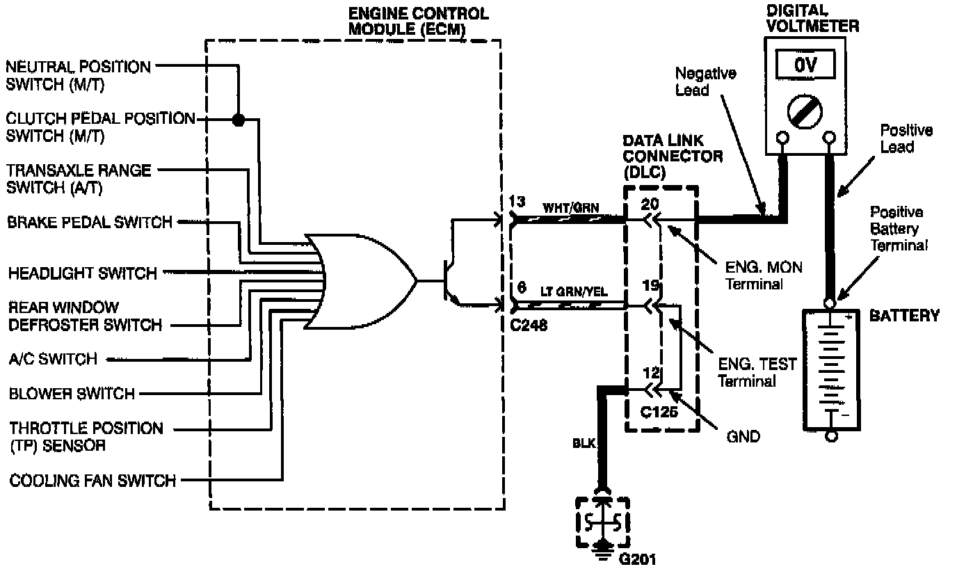 - Place a digital voltmeter in series between the battery and the ENG. MON. terminal of the data link connector (DLC).