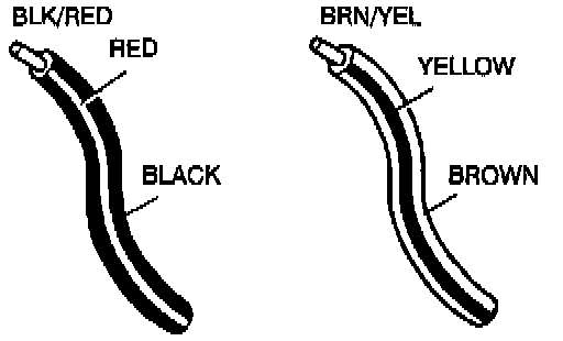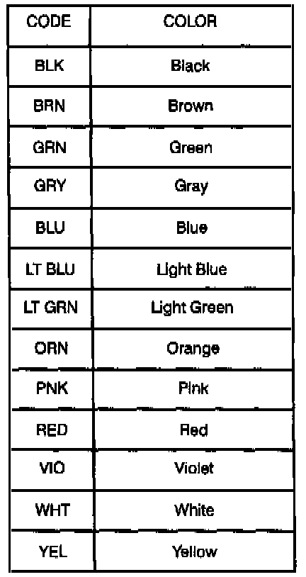 Two-color wires are indicated by a two-color code symbol. The first color indicates the base color of the wire; the second color indicates the color of the stripe.