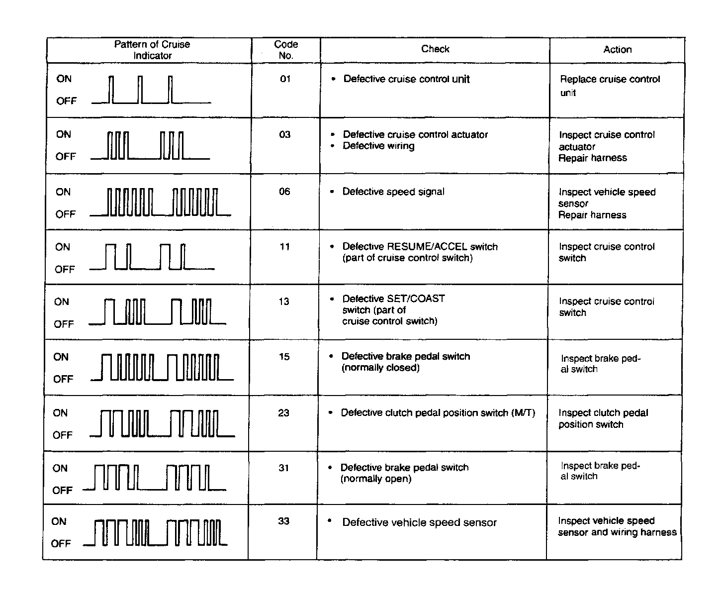 Condition/operation codes, stored in the cruise control memory, are indicated by the cruise indicator in the instrument cluster. (Refer to condition code numbers below). Stored codes are deleted when the ignition switch is turned to OFF. In addition, the memory will hold only a single code at any time: If multiple malfunctions are present, the first one displayed will have to be corrected before the next code can be displayed.