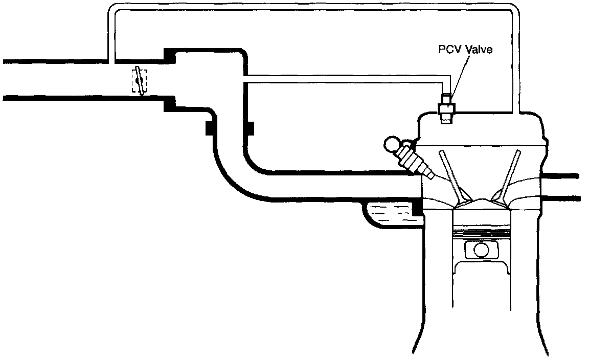 The PCV valve is operated by the intake manifold vacuum. When the engine is running at idle, the PCV valve is opened slightly and a small amount of blowby gas is drawn into the dynamic chamber to be burned. As the engine speed rises the PCV valve is opened further, allowing a larger amount of blowby gas to be drawn into the dynamic chamber.