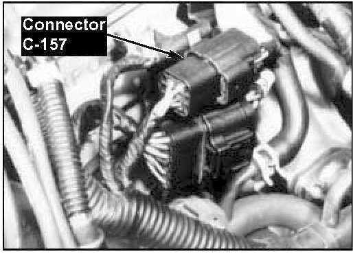 1. Locate connector C-157, (6 pin black connector) on the left side of the engine compartment, mounted to the rear of the cylinder head next to the distributor.