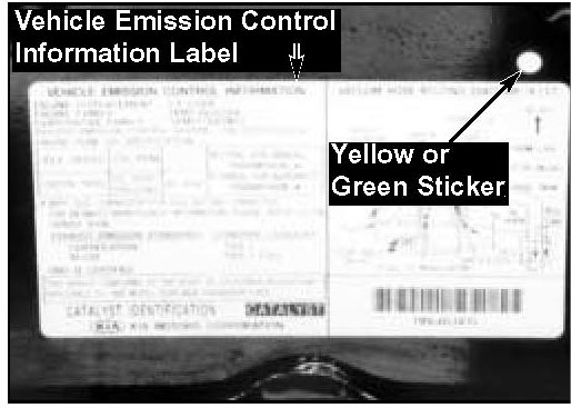 2. Check for a white mark located on the top of connector C-157 (6 pin black connector) and/or a yellow or green sticker located above the right corner of the underhood Vehicle Emission Control Information Label.