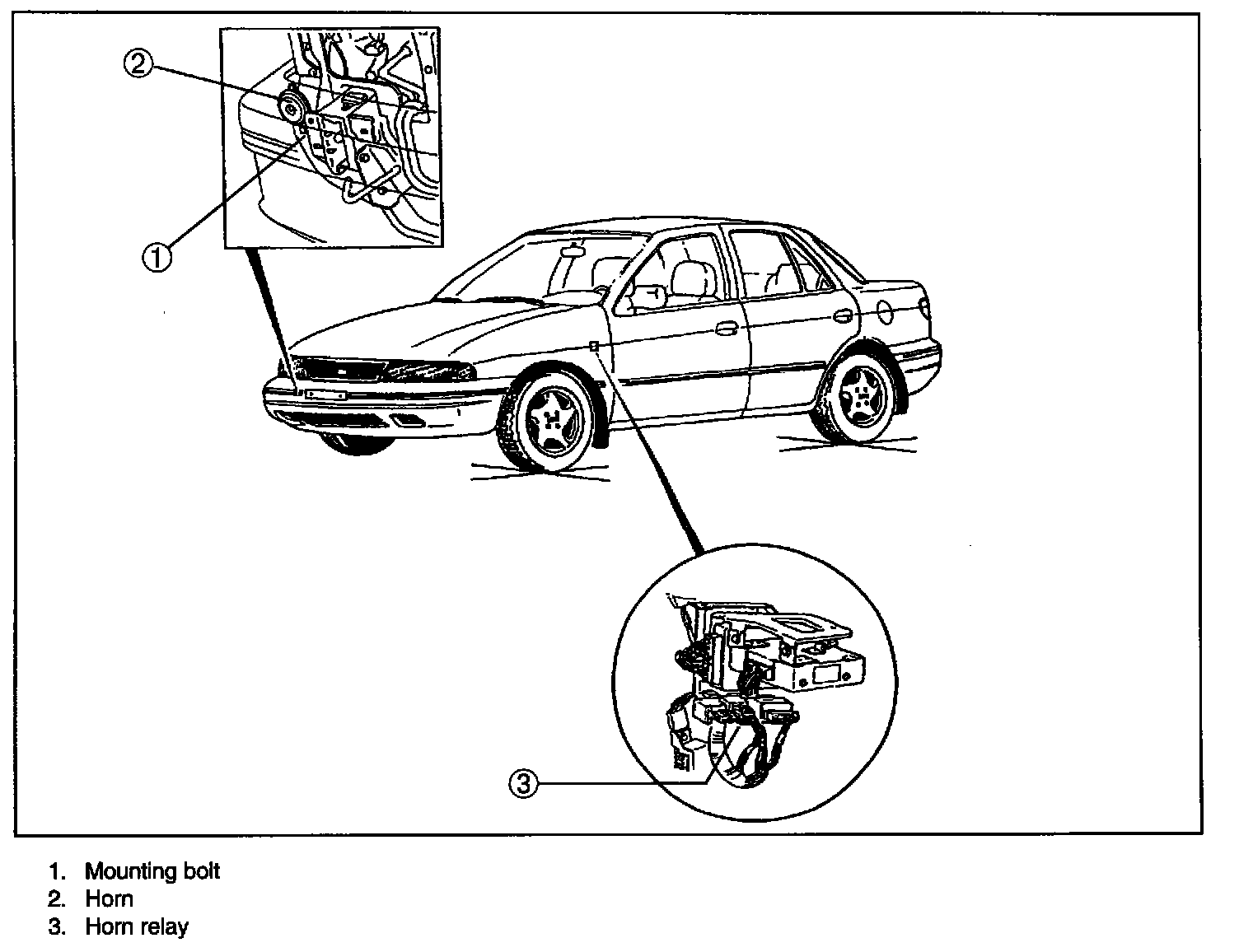 2. Disconnect the horn connector, remove its mounting bolt, and then remove the horn.