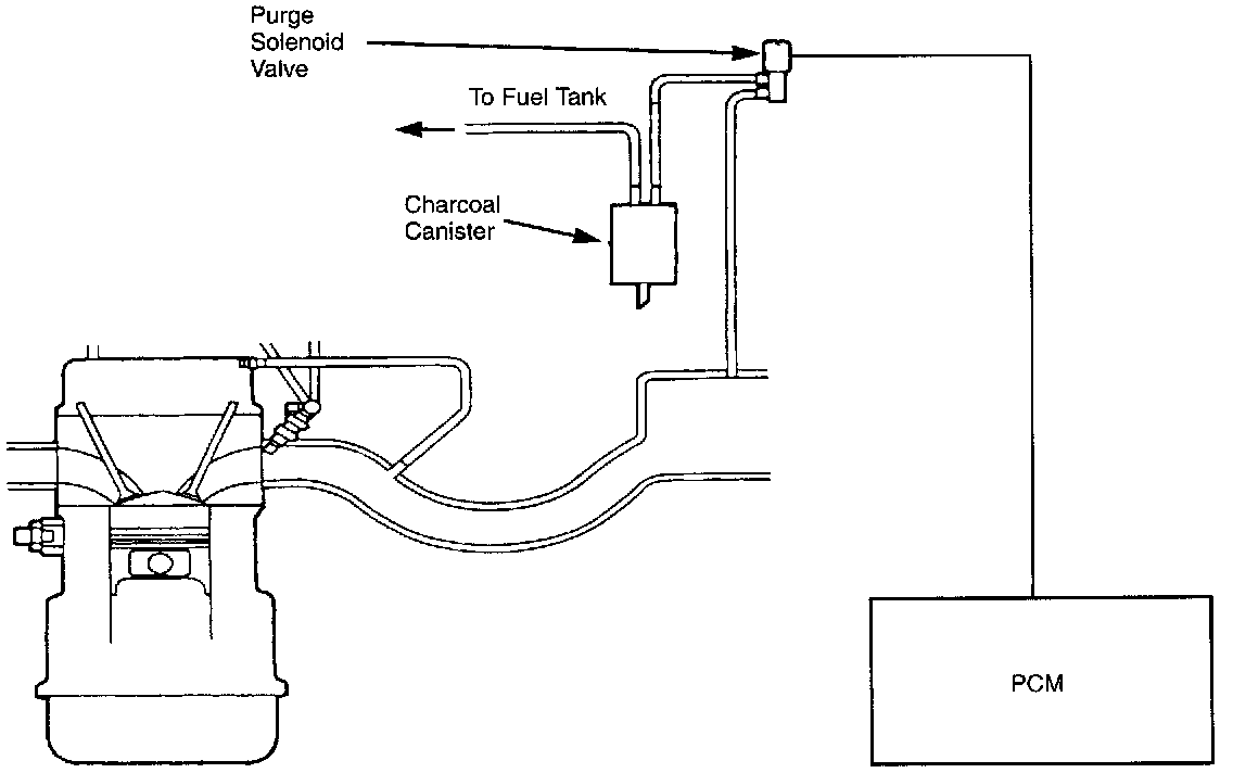 The evaporative emission control system consists of fuel separator, the two-way check valve, the charcoal canister, the purge solenoid valve, the powertrain control module (PCM), and the input devices. The amount of evaporative fumes introduced into the engine and burned is controlled by the purge control solenoid valve to correspond the engine's operating conditions. The maintain best engine performance, the purge control solenoid valve is controlled by the PCM.