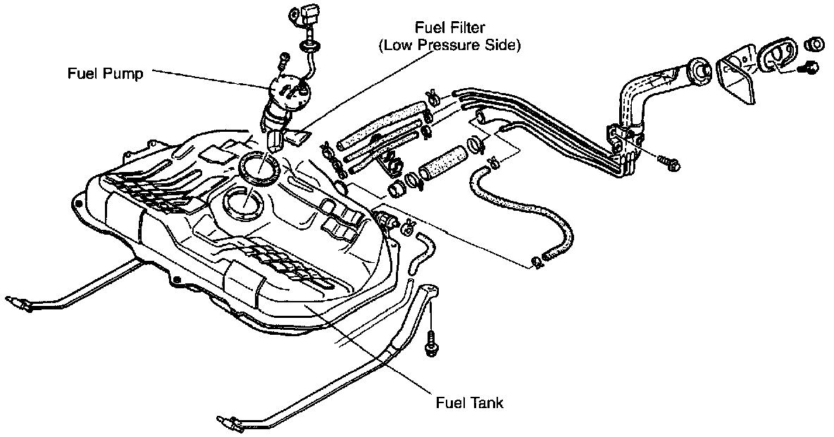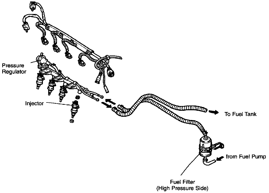 This system supplies the necessary fuel for combustion at a regulated pressure to the fuel injectors. Fuel is metered and injected into the intake ports according to injection control signals from the engine control module (ECM). The system consists of the fuel tank, the fuel pump, the fuel filters, the delivery pipe, the pressure regulator, the fuel injectors, and the fuel pump relay.