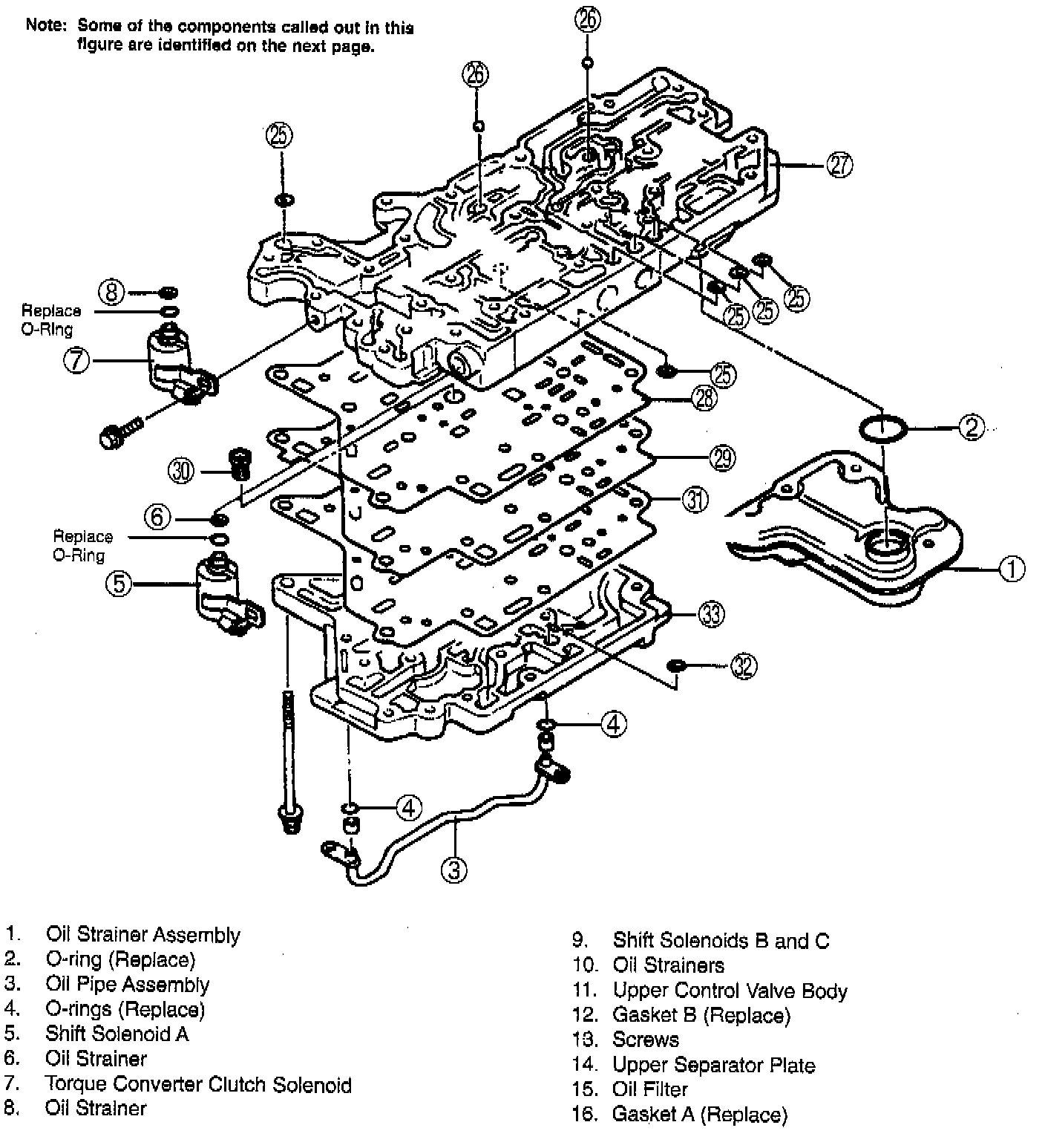 4. Remove the torque converter clutch solenoid valve and oil strainer.