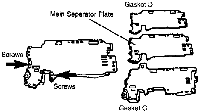 16. Remove gasket E, the lower separator plate, the oil filter, and gasket F.