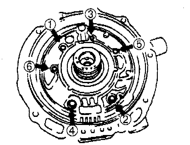 1. Loosen the mounting bolts evenly in the pattern shown and remove the oil pump cover from the oil pump housing.