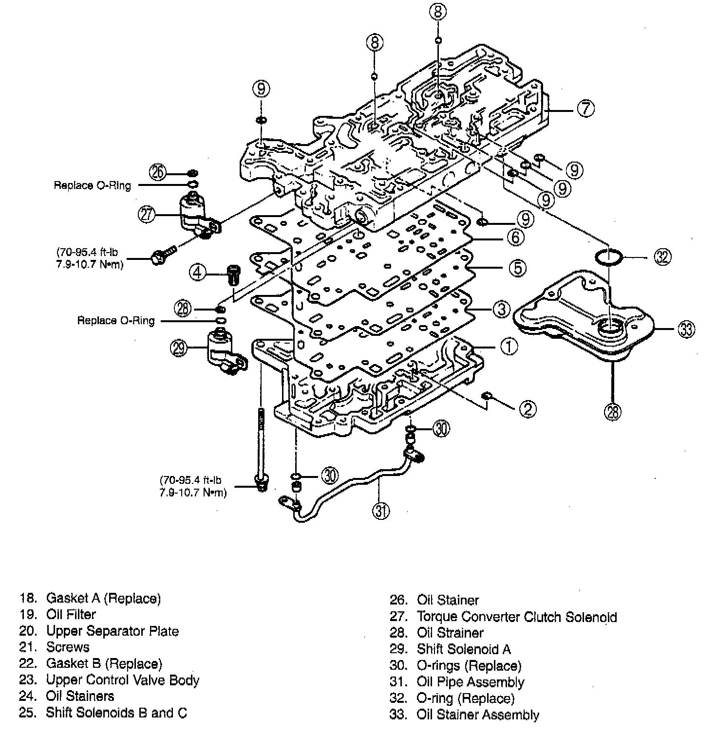 20. Install shift solenoid A and oil strainer onto the upper valve body.