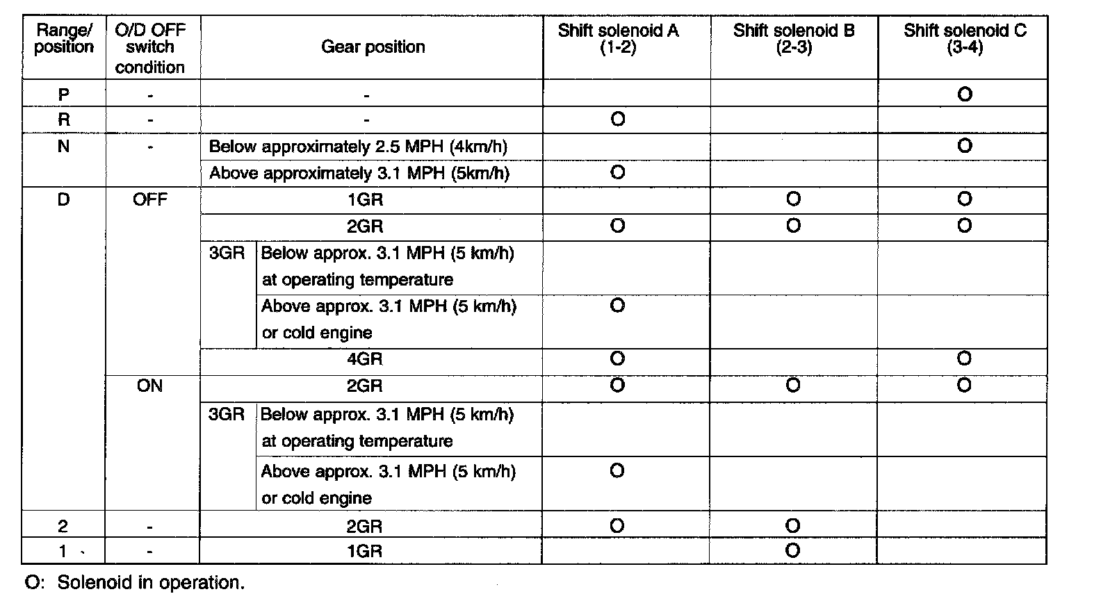SOLENOID VALVE OPERATION TABLE: O/D OFF SYSTEM