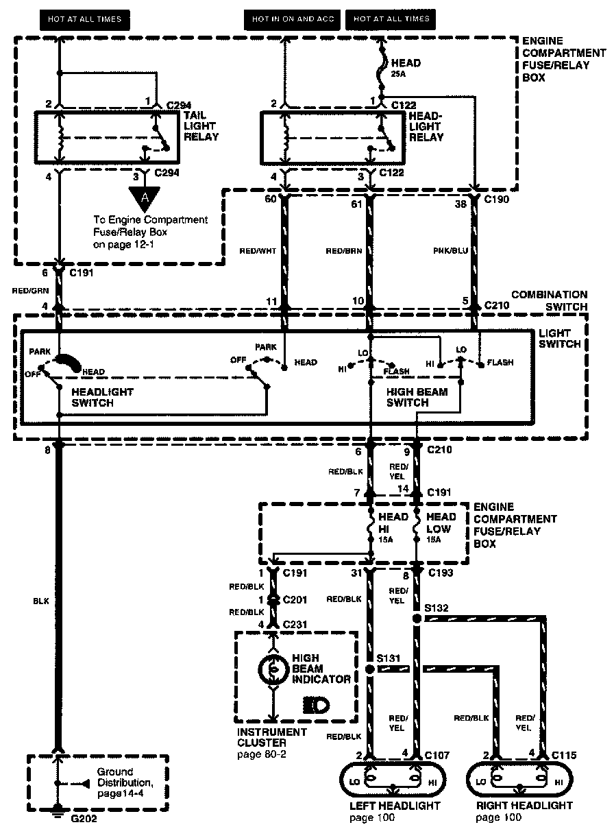 The Light Switch Details schematic shows all the wiring between the light switch and the components connected to the output of the light switch. The Light Switch Details schematic is extremely helpful in locating a short circuit on the output side of the light switch.