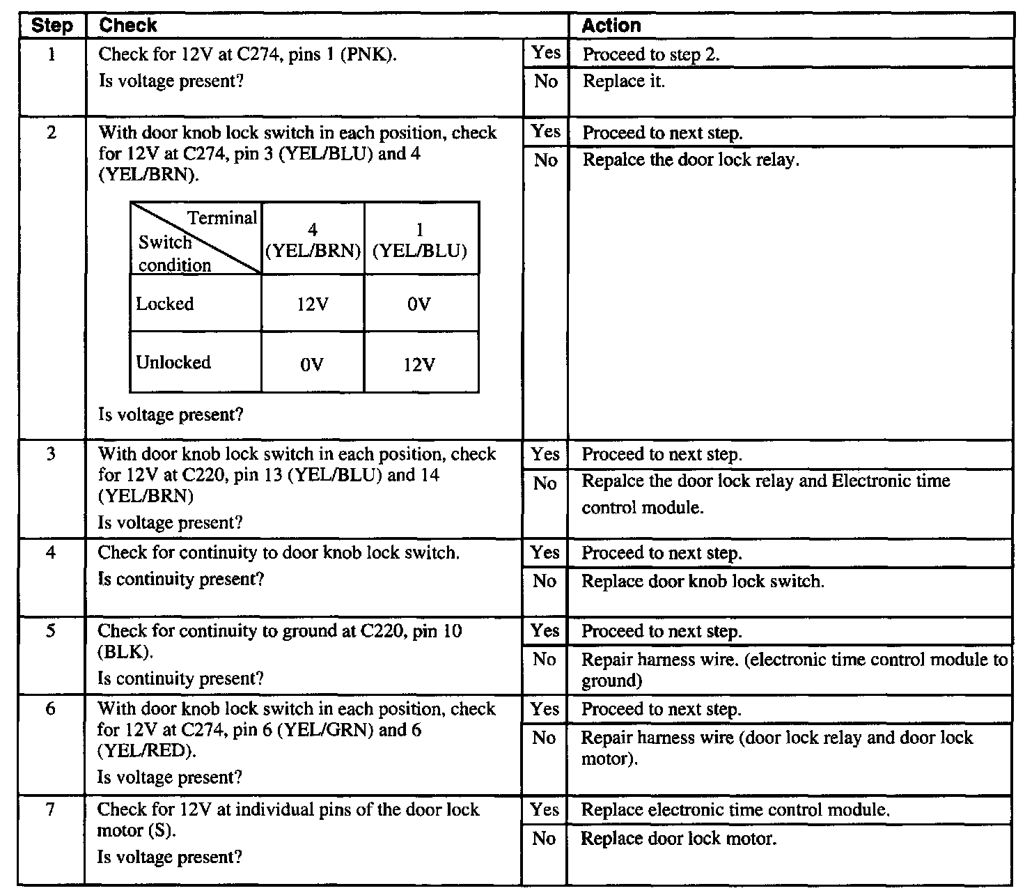 Preliminary Check: Check condition of DOOR LOCK fuses. If either fuse is open, locate and repair source of overload. Replace fuse. If only one (1) door lock does not function, skip steps 1-4 and perform step 5 for that specific door.