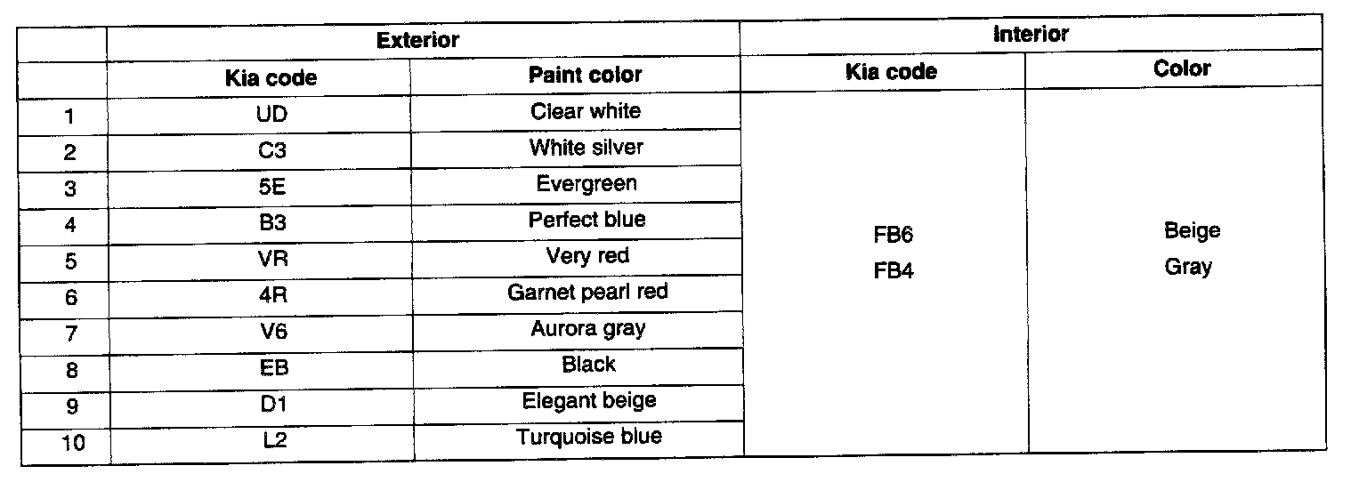 The chart shown contains the available colors and codes.