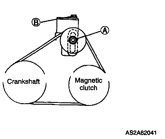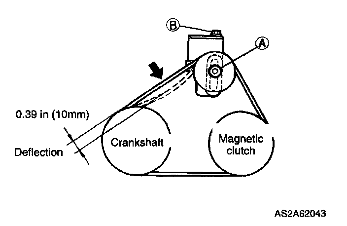 2. Turn adjusting bolt B and adjust deflection of drive belt to within specification.