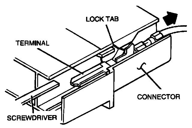 Insert a push-tool, or thin piece of metal such as a small screwdriver, from the terminal side of the connector, and then, with the locking tabs pressed down, pull the terminal out from the rear side of the connector.