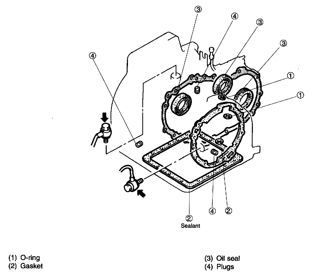 Check for transaxle fluid leaks at points shown below and repair or replace as necessary. Additionally, check all of following: