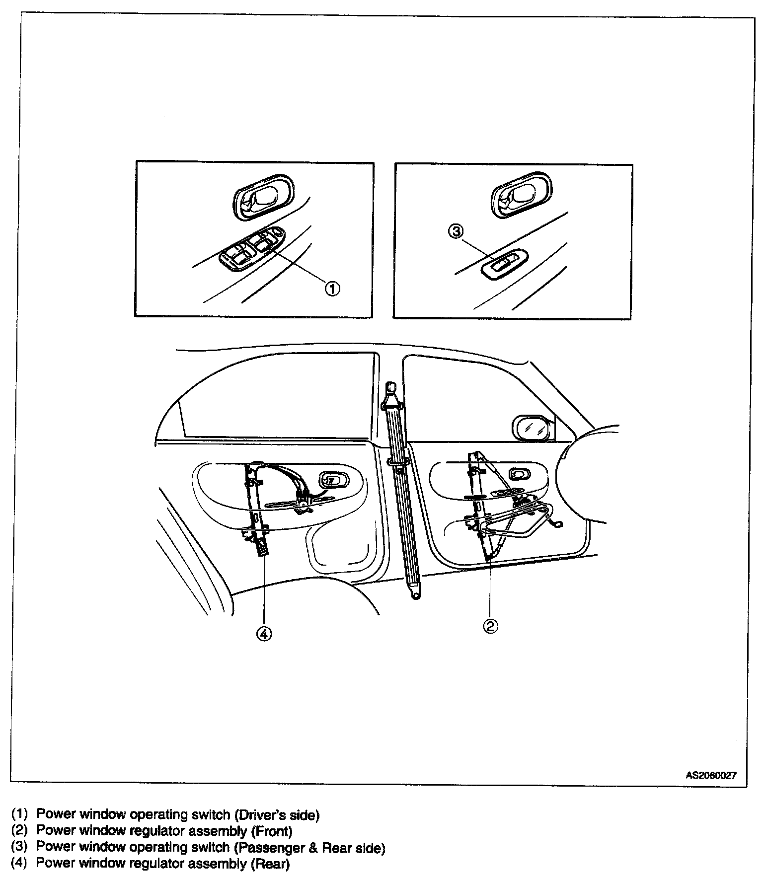 Power window system allows front and rear side door windows to be operated electrically. Each window is raised or lowered using a bi-directional electric motor attached by continuous cable to window regulator. Window motors are controlled by switches mounted on front and rear side doors. Driver's door contains main power window switch assembly that controls each of other three doors.