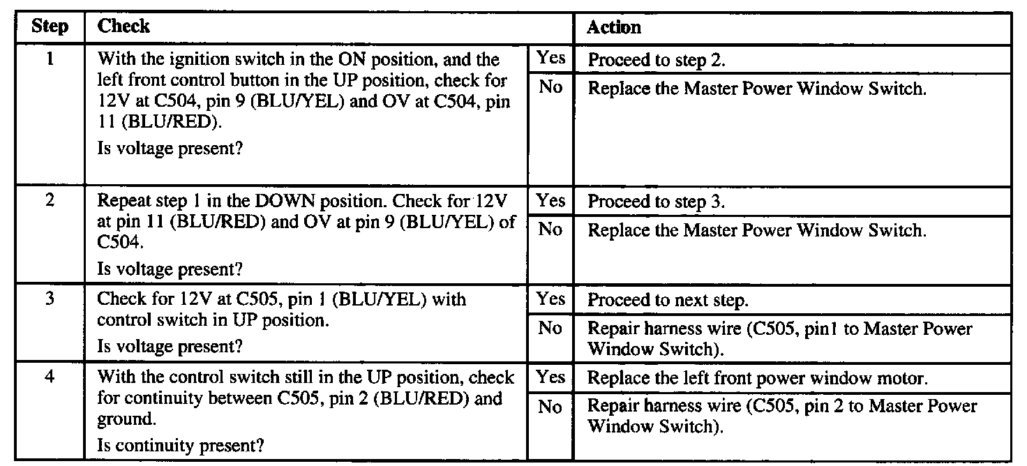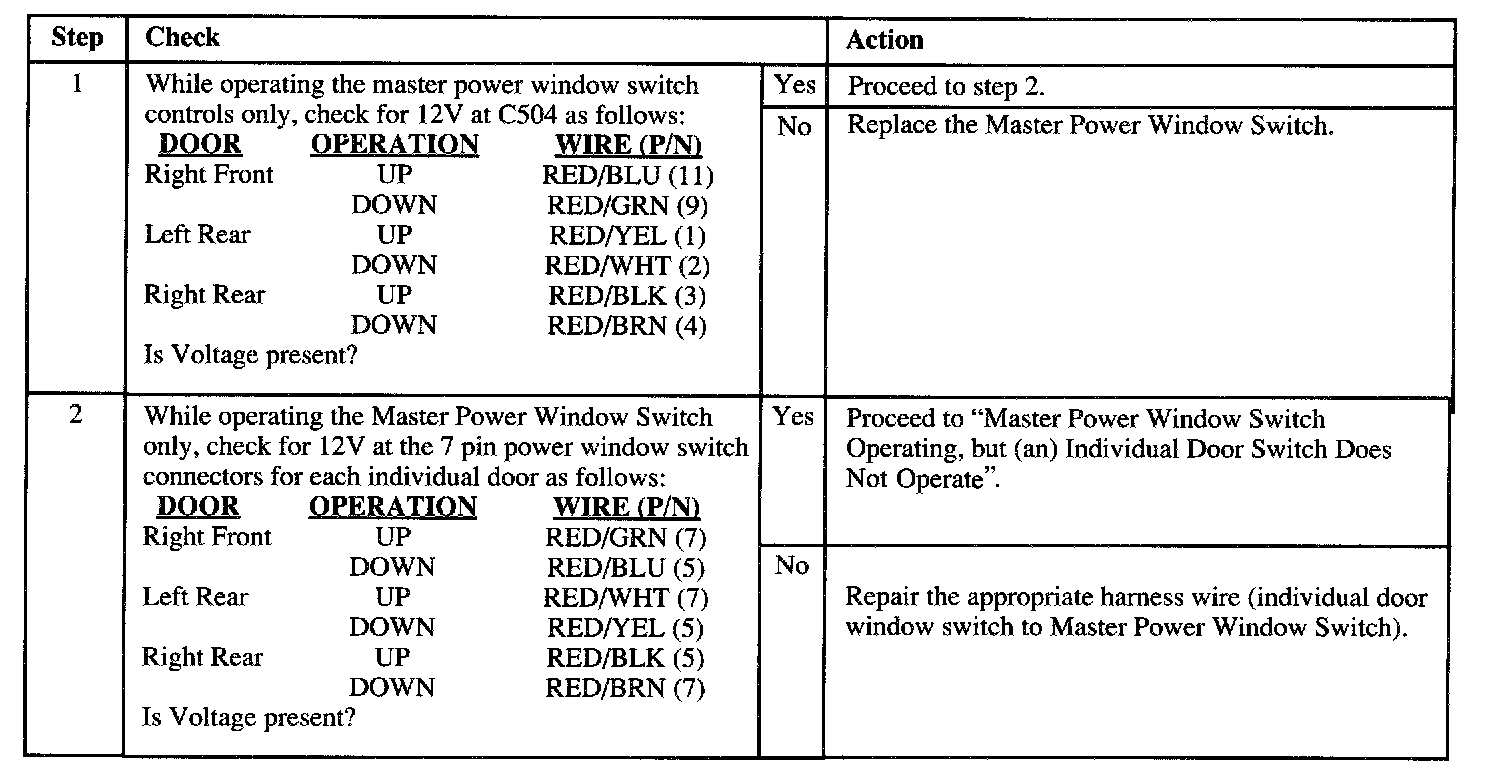 Preliminary Check: Verify that the other windows operate. If they do not, first perform procedure for None of the Power Windows Operate, above.