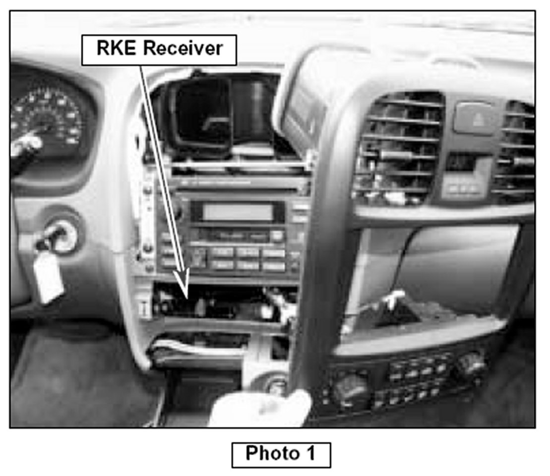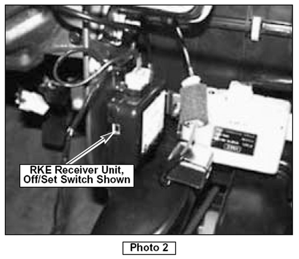 Pull center facia panel (no need to unplug connectors) and move to right hand side for access to the receiver. Make sure all doors, trunk and hood are closed and key is removed from ignition. Locate the switch on the receiver (see photo 2) and note the "off" and "set" positions. Programming is done in the "set" position, and needs to be completed within 10 seconds after moving the switch on the receiver to "set" position.