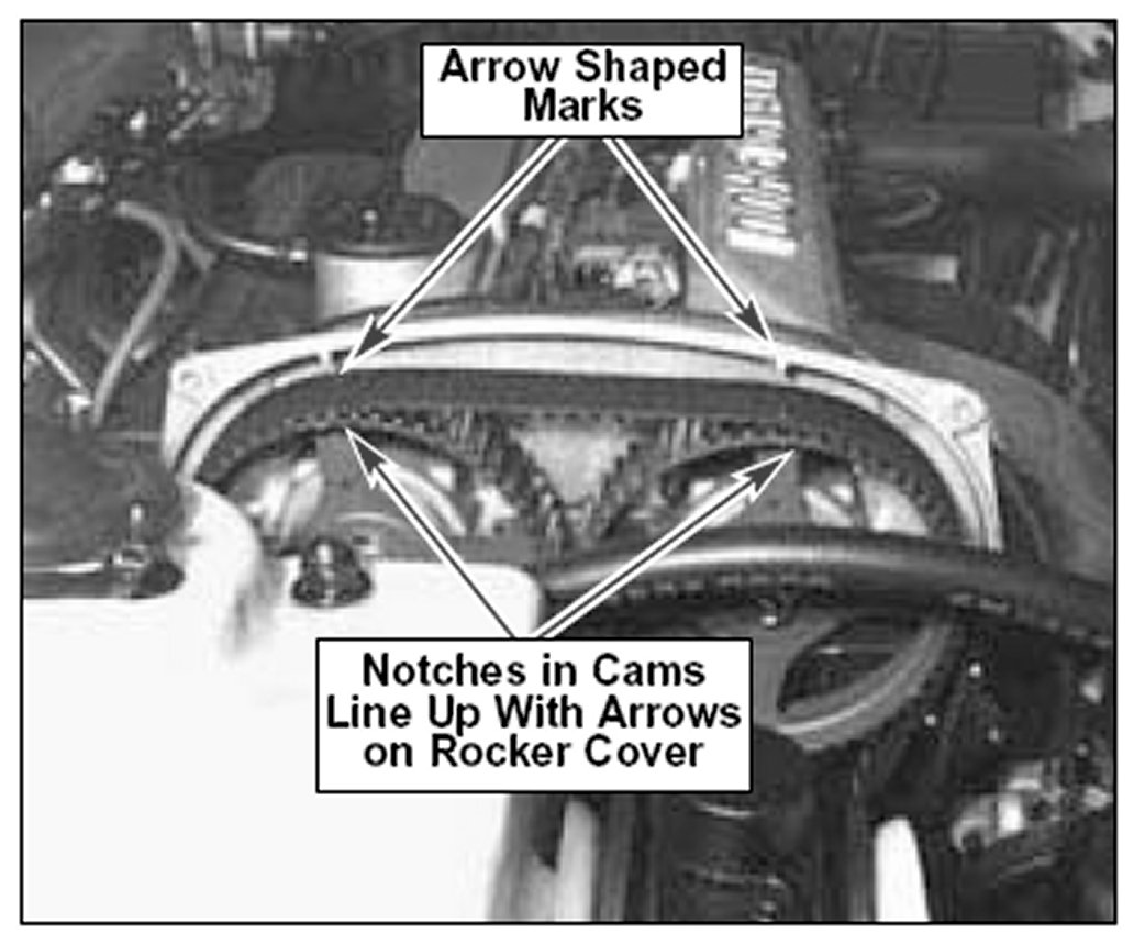If timing marks are not aligned, cam timing must be reset. To correct incidence of timing belt jumping in Optima 4 cylinder engines, a belt guide has been added to the inside of the upper timing belt cover from 1/29/01 production.