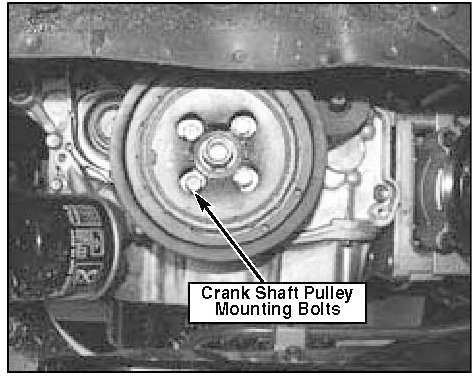 11. Remove bolts (4) securing crankshaft pulley/vibration damper to crankshaft, and remove pulley.