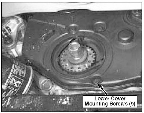 13. Remove bolts (9) securing lower timing belt cover to engine, and remove cover.