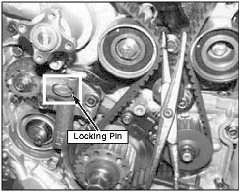 Do not use undue force or sharp or rough-edged tools to move tensioner as damage to the timing belt may occur. If no suitable spreader is available, remove tensioner by loosening two attaching bolts. Compress per above in soft-jawed vice, install locking pin and reinstall tensioner on engine.