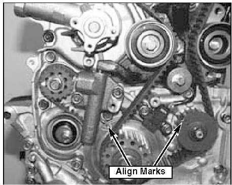 17. Rotate crankshaft two full turns, then recheck camshaft pulley timing. If incorrect, repeat step 15 and 16.