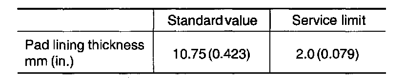 2. Check the pad thickness through the cylinder inspection hole. If the pad lining thickness is out of specification, replace the pads.