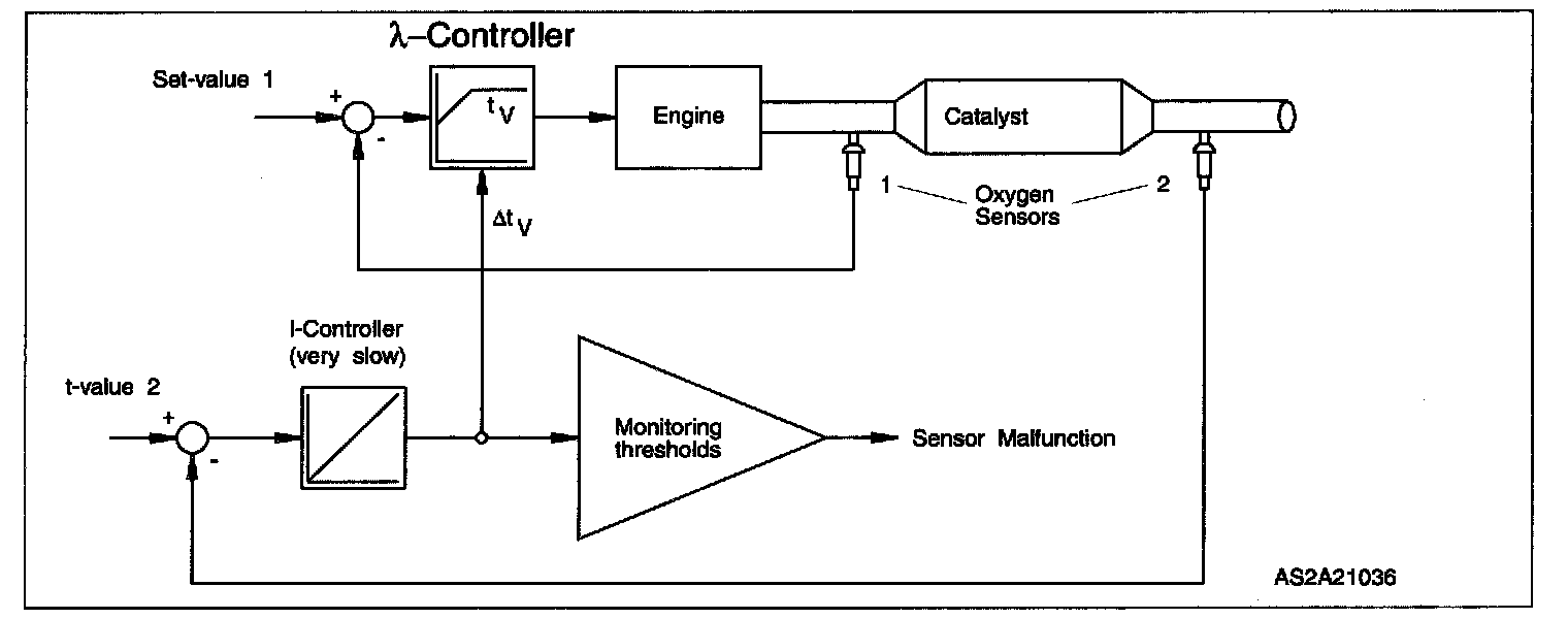 The sensor aging is monitored by comparing the front and rear HO2S and also using the correction value (Tv) which determines the mean value of the lean/rich shift necessary for optimal air/fuel ratio-control. With the help of this information, the ECM can make allowance for aging of the front HO2S in its injection period calculations. When the parameter-Tv is above or below the specific limits, the ECM will set the diagnostic trouble code HO2S Slow Response by aging.