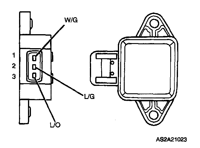 3. Connect voltmeter between terminals 2(L/G) and 1(W/G) on throttle position sensor connector. Check for 5 V reference voltage.