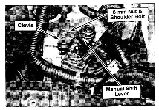 4. Remove 6 mm nut and shoulder bolt that attaches clevis to manual shift lever.