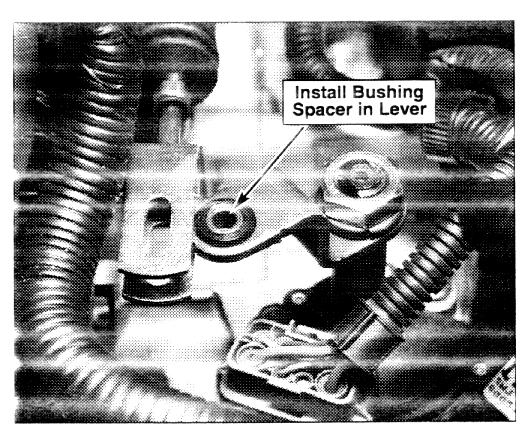 8. Install new bushing spacer into shift lever bushing and re-connect clevis to manual shift lever by installing shoulder bolt and 6 mm nut; ensure shoulder fits into clevis slot, but do not tighten nut at this time.