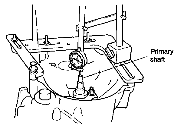 3. Mount the dial indicator to the transaxle hanger and measure the primary shaft thrust clearance.