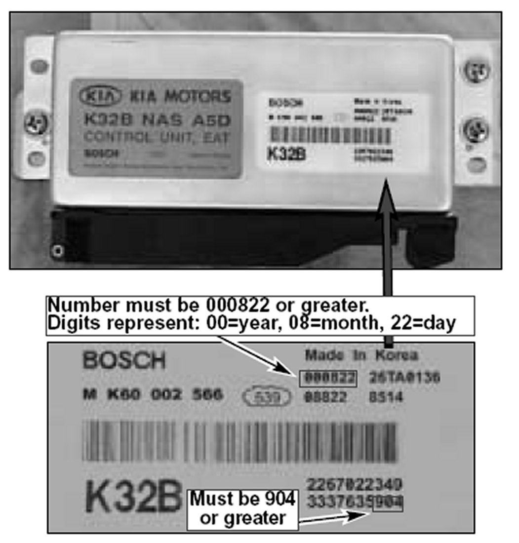 For in-use complaint vehicles produced prior to this change, replace the TCM. (There is no P/N change, however all TCMs in KMA Parts Distribution Centers have the revised software.)