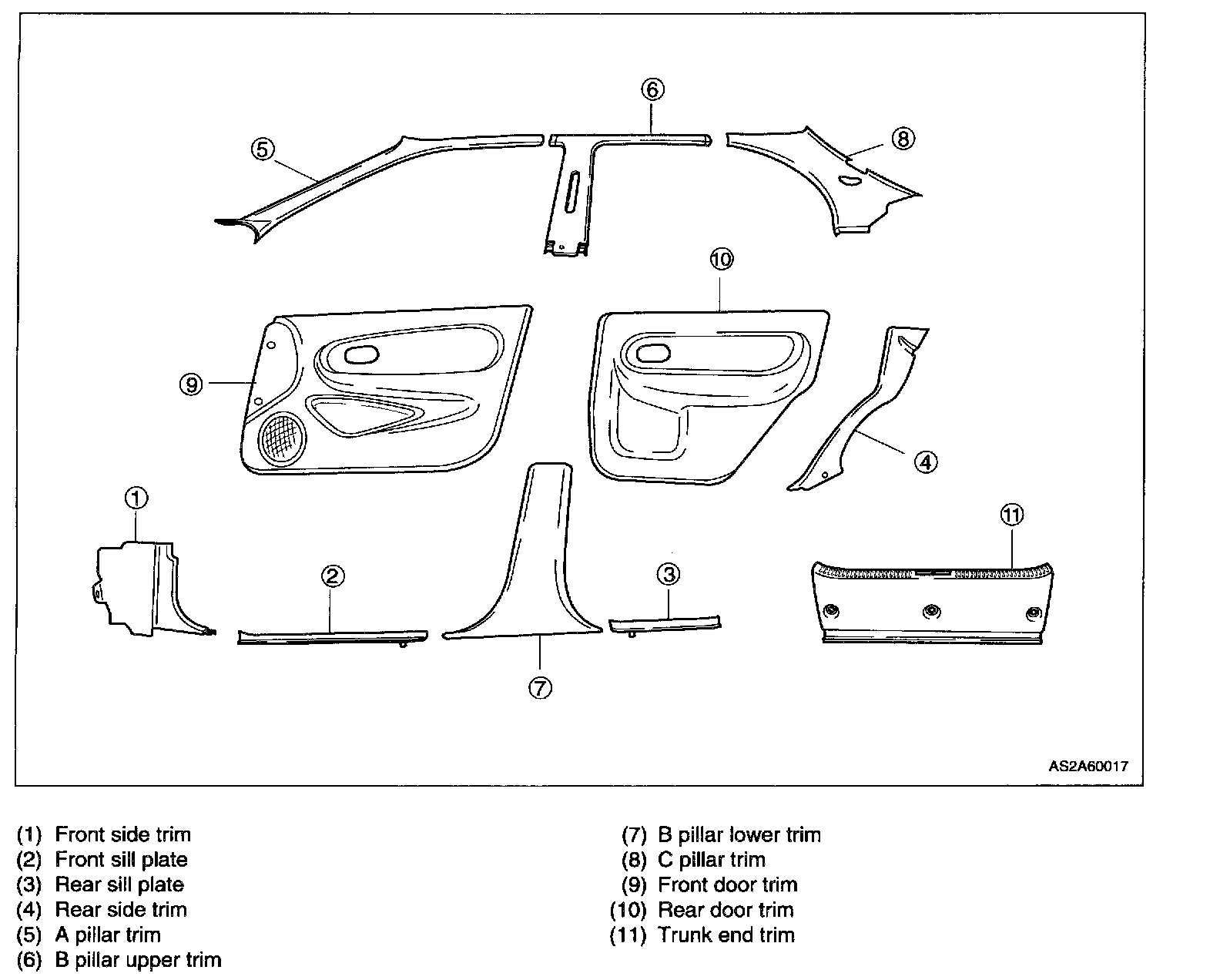 It is used on all four doors of vehicle door opening sills, A, B and C pillars, front side, rear side and end trim. All door trim on vehicle includes pull handle. Each trim on front two doors provides a pocket for keeping maps, etc.