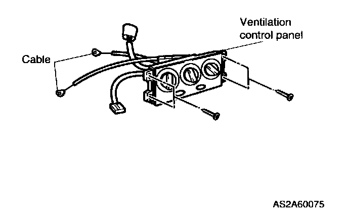 6. Remove temperature cable and mode cable from heater unit by carefully depressing plastic retaining tab and remove cable from retaining clip. Refer to Air Conditioner