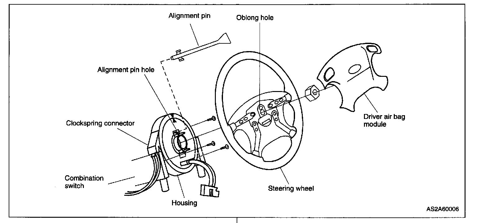 Note: An alignment pin is used to aid in alignment of clockspring connector when installing steering wheel onto steering column. An alignment pin is provided with a new combination switch, but a substitute pin will be needed when re-aligning an original clockspring. Substitute pin should be 3 mm (0.12 in) in diameter and at least 76 mm (3.0 in) long.
