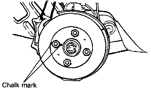 1 Before removing the brake disc, chalk both sides of the wheel stud on the side at which run-out is greatest.