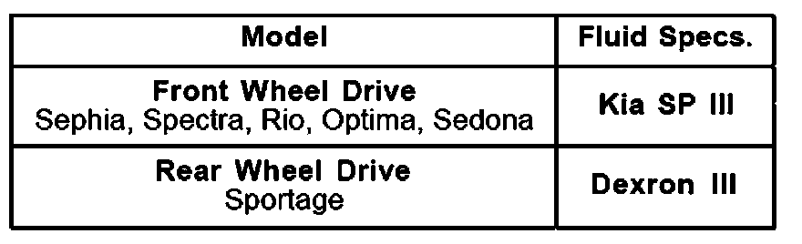 The automatic transmission fluid specification has changed to Kia SP III ATF for all older Sephia vehicles and all remanufactured automatic transmissions.