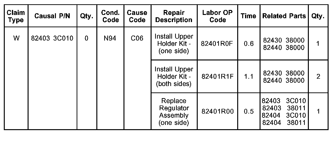 This bulletin provides information relating to window regulator repair on Optima. Some 2001-2002MY Optima models produced before 12/4/01 may experience conditions where the front door glass will not go up or down properly and/or will not stay fully closed. To correct these conditions, use the procedures outlined in this bulletin.
